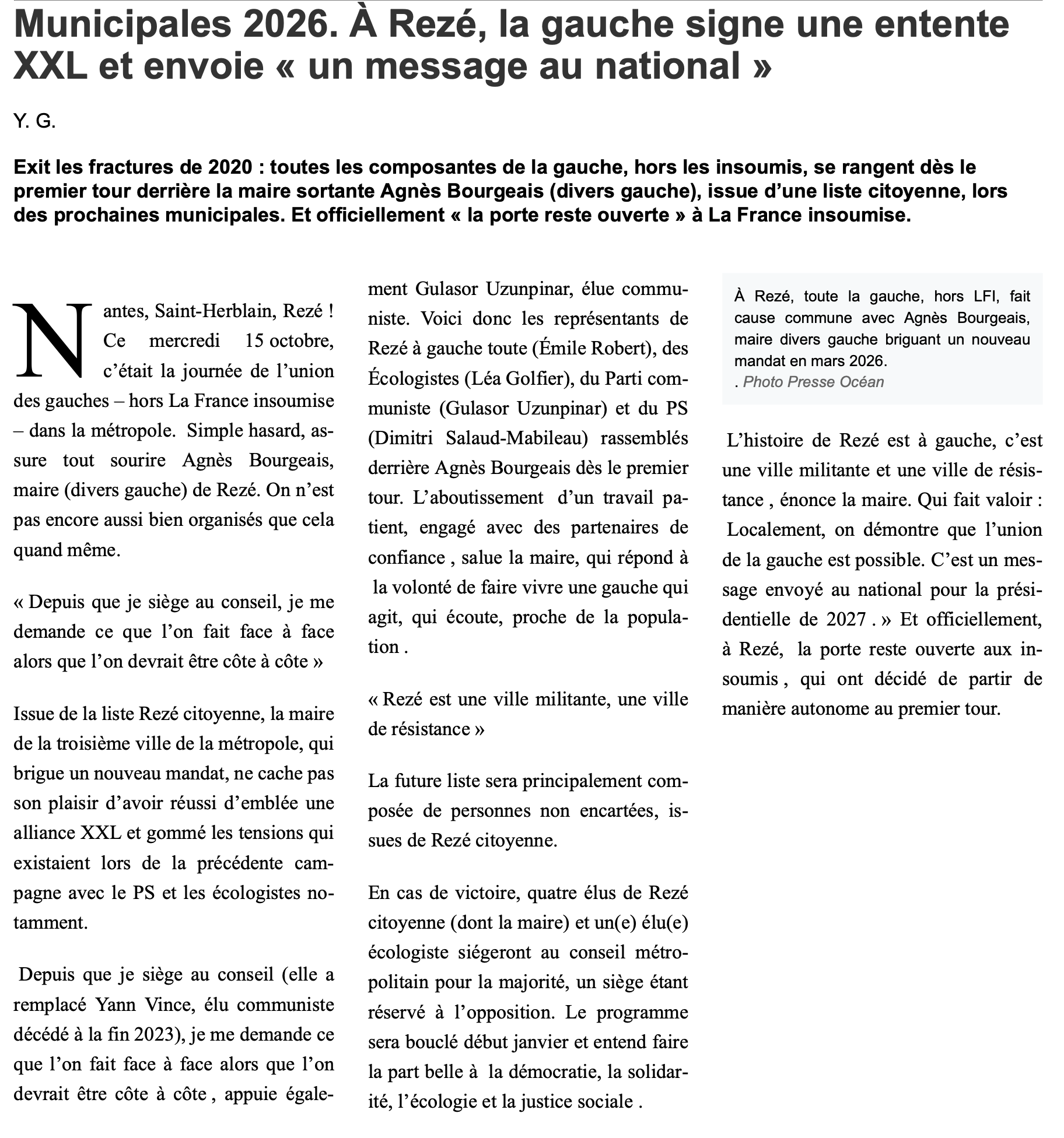 Un article de Presse Océan revient sur la conférence de presse commune des organisations de gauche à Rezé pour les municipales de l’an prochain.